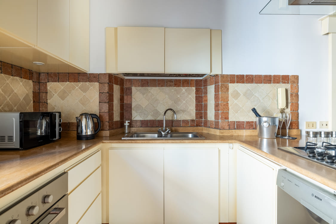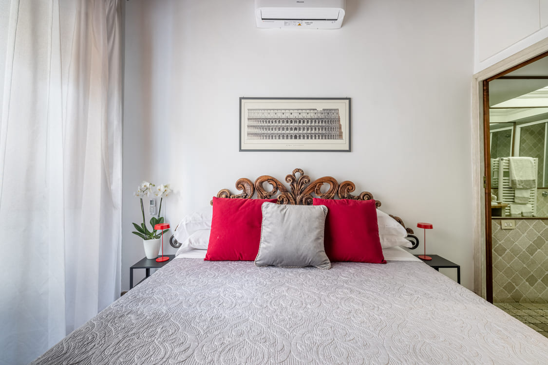 Si compone di uno splendido ampio salotto, con comodo divano letto e poltrona, che affaccia su uno scorcio dei Fori Romani. Da un lato del luminoso soggiorno, si accede all’ampia e spaziosa cucina, dotata di zona pranzo, e numerosi vani ed elettrodomestici, piano cottura a gas (5 fuochi), forno elettrico e microonde, macchina a capsule per il caffè e frigorifero con freezer. Adiacente alla sala, dal lato opposto della cucina, si ha accesso alla zona notte: una prima elegante camera con letto matrimoniale, con una testiera letto di legno intarsiato e ampi armadi a muro, dotata di proprio bagno privato con doccia; una seconda stanza matrimoniale con un arredo più moderno e, a sua volta fornita di spaziosi vani armadio. Il secondo bagno, sempre con doccia, presenta dettagli in legno e marmo, come il primo.